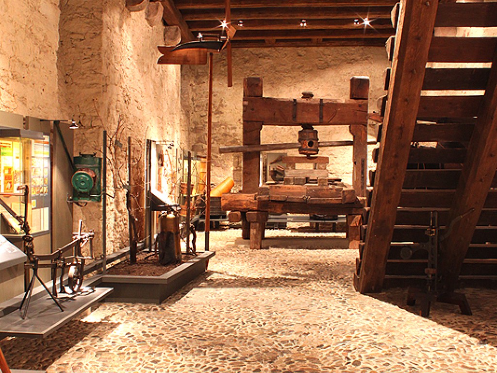 Verschiedene Gerätschaften illustrieren die Arbeitsschritte im Rebberg und rund um das Pressen der Trauben. Weinfässer und kunstvoll geschnitzte Fassriegel sind seltene Zeugen der einstigen Handwerkskunst. Alte Wirtshausschilder, Weinetiketten und Krüge lassen dabei schnell einmal Lust auf ein Glas Wein - zum Beispiel aus dem gemeindeeigenenRebberg am Schlipf - aufkommen.