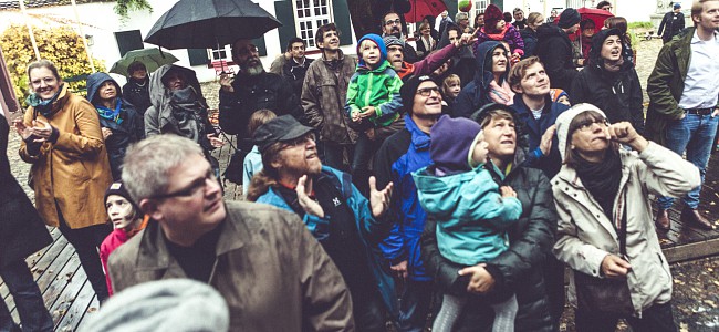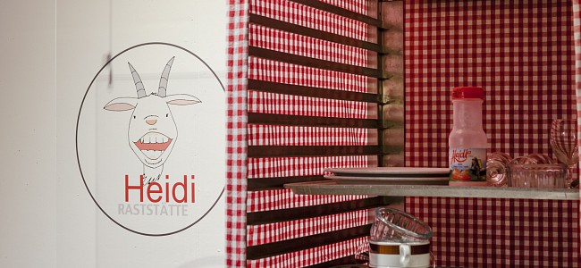 Auf rauschende Tannen folgt ein Heuschober mit kratzendem Stroh von dem aus man den Mond beobachten kann. Daneben befindet sich eine duftende Alpenwiese. Vögel zwitschern und die Sonne brennt. Dann gelangt der Besucher an die Heidi-Raststätte und eher man sich versieht ist man in der Stadt angekommen. Es duftet nicht mehr und die Vögel sind verstummt. Dafür gibt es einen Schrebergarten, Karaoke, Taubengurren und ein Kiosk voller Angebote.